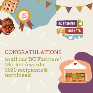 All nominees are judged by a committee representing BCAFM partners and stakeholders across BC. The recipients are honoured during the BC Farmers’ Markets Awards virtual ceremony at the 2021 BC Farmers’ Markets Virtual Conference on February 19, 2021.